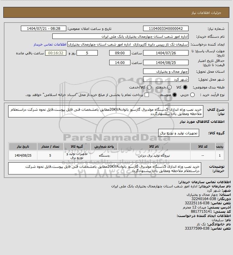 شرح کلی نیاز: خرید نصب وراه اندازی 5دستگاه مولدبرق گازسوز باتوان20KVAمطابق بامشخصات فنی فایل پیوست.فایل نحوه شرکت دراستعلام ملاحظه ومطابق باآن پیشنهادگردد