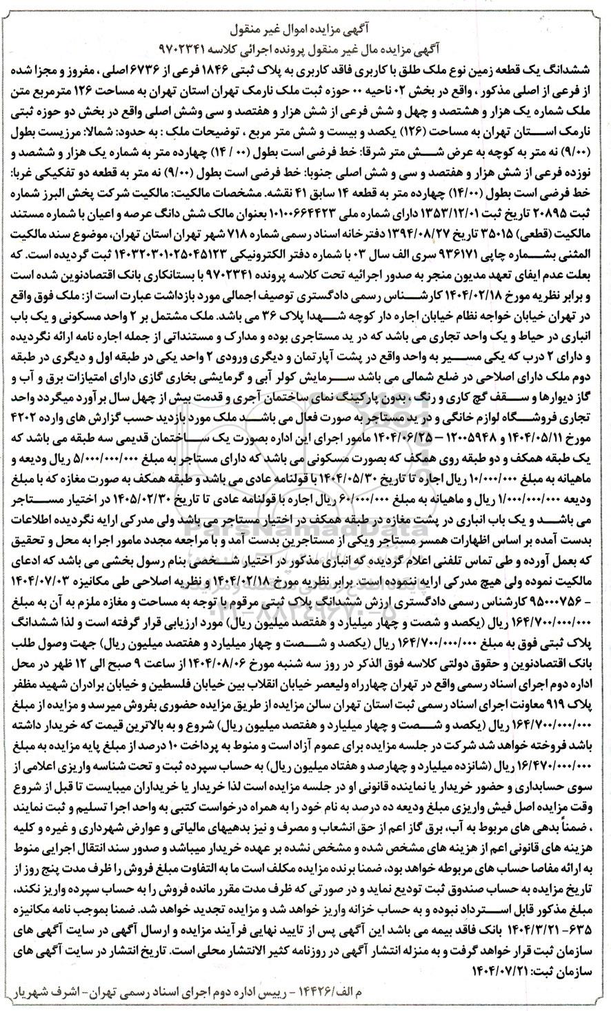 آگهی مزایده مال غیر منقول پرونده اجرائی کلاسه 9702341 ششدانگ یک قطعه زمین نوع ملک طلق با کاربری فاقد کاربری به پلاک ثبتی 1846 فرعی از 6736 اصلی . مغرور و مجزا شده از فرعی از اصلی مذکور، واقع در بخش 02 ناحیه 00 حوزه ثبت ملک نارمک تهران استان تهران به مساحت 126 متر مربع