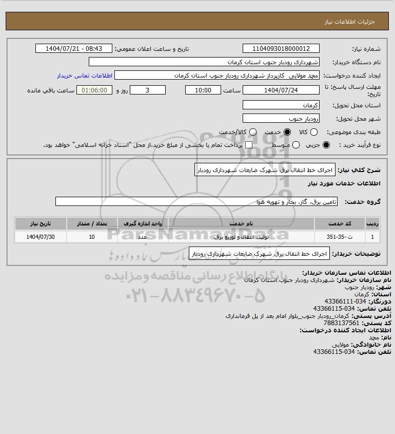 شرح کلی نیاز: اجرای خط انتقال برق شهرک ضایعات شهرداری رودبار