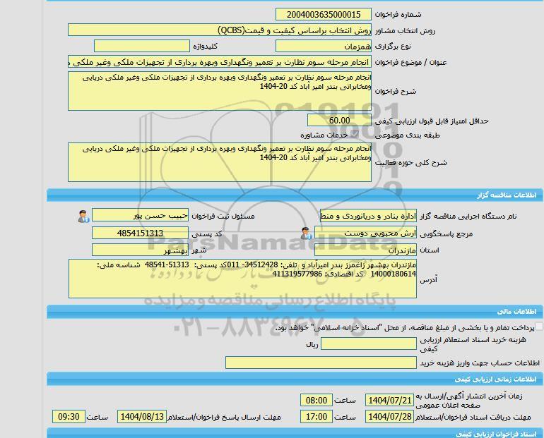 مناقصه خرید خدمات مشاوره انجام مرحله سوم نظارت بر تعمیر ونگهداری وبهره برداری از تجهیزات ملکی وغیر ملکی دریایی ومخابراتی بندر امیر آباد کد 20-1404 از کلیه افراد متخصص و شرکتها واجد شرایط دعوت به عمل میآید در مناقصه با کد خبرگزاری پارس نماد: 9688773 شرکت نمایند.