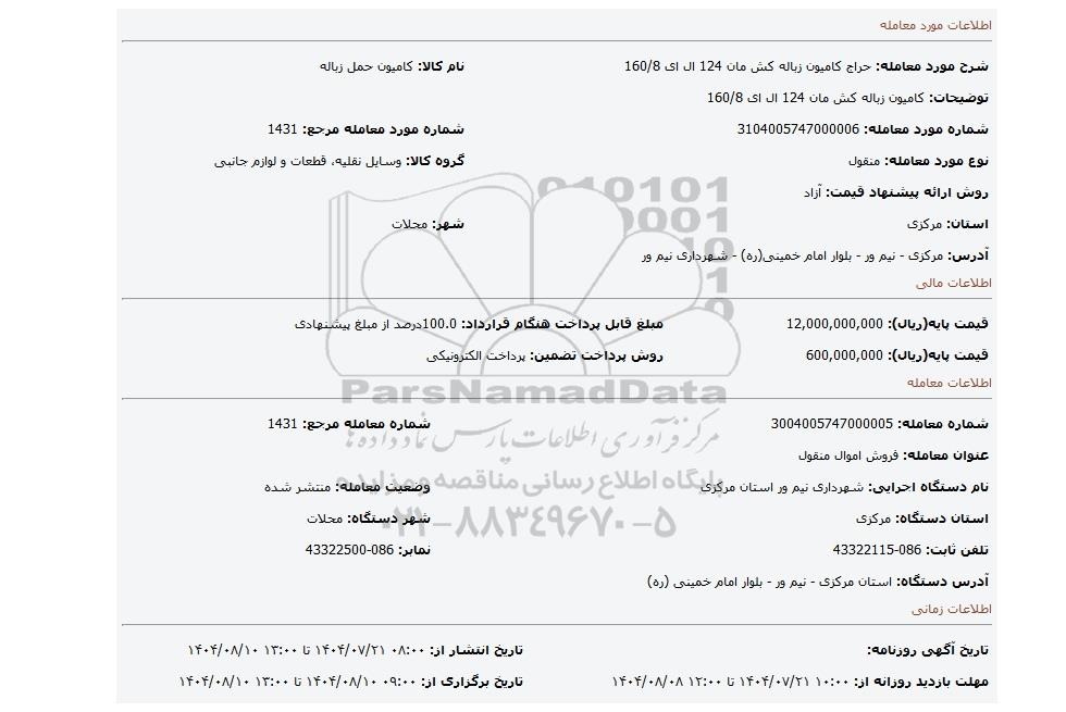 | نام دستگاه اجرایی: شهرداری نیم ور استان مرکزی | وضعیت معامله: منتشر شده | |