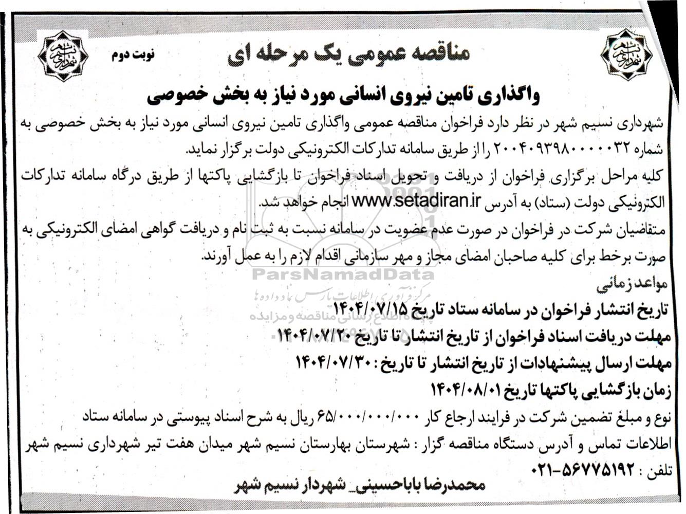 شهرداری نسیم شهر در نظر دارد فراخوان مناقصه عمومی واگذاری تامین نیروی انسانی مورد نیاز به بخش خصوصی به شماره 2004093980000032 را از طریق سامانه تدارکات الکترونیک دولت برگزار نماید.
