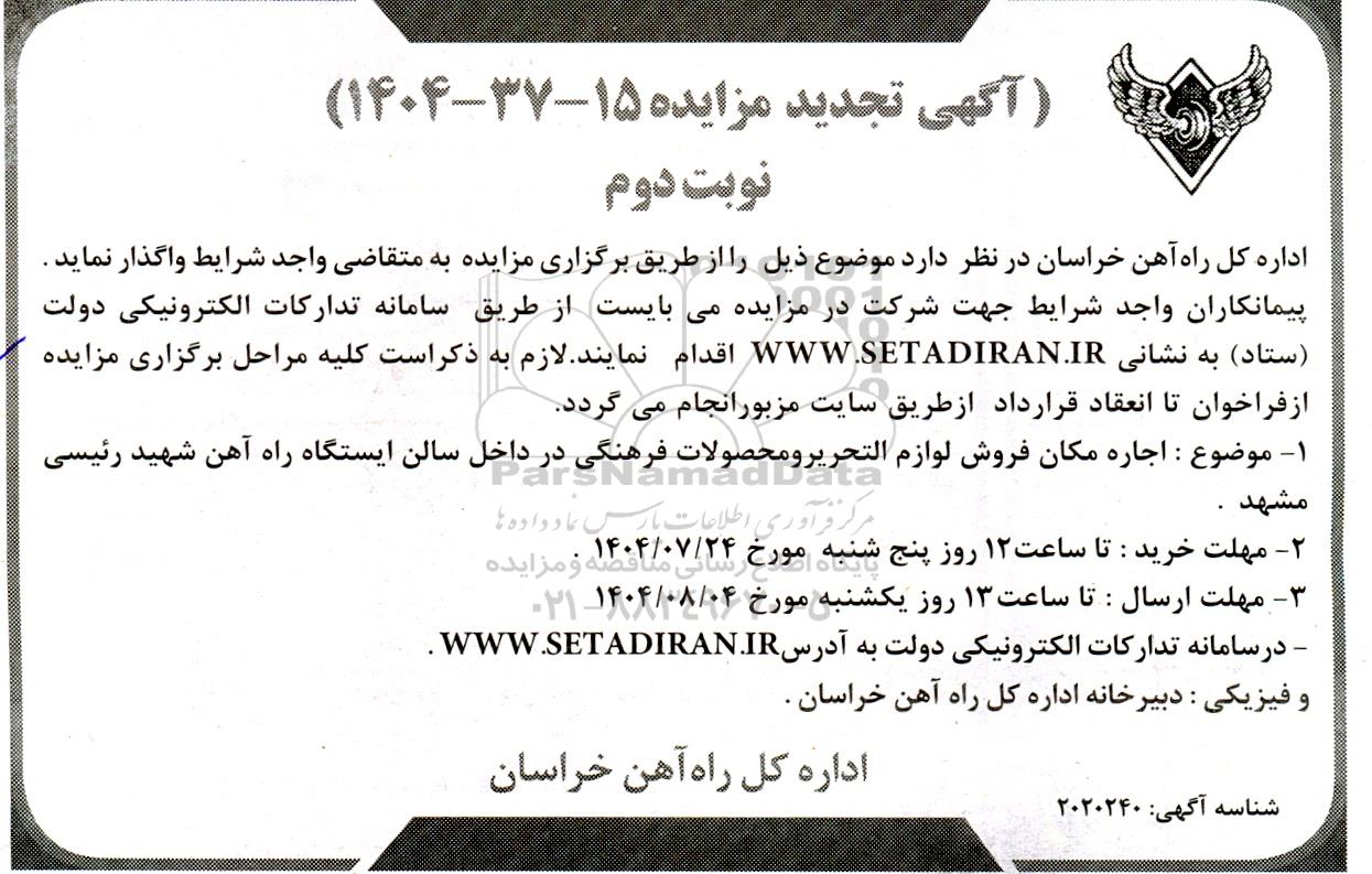 تجدید مزایده اجاره مکان فروش لوازم التحریر و محصولات فرهنگی در داخل سالن ایستگاه راه آهن - نوبت دوم