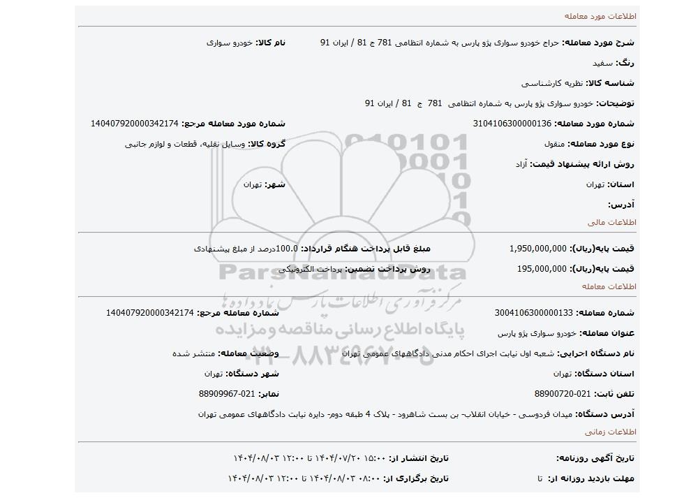 شرح مورد معامله: حراج خودرو سواری پژو پارس به شماره انتظامی 781 ج 81 / ایران 91 نام کالا: خودرو سواری