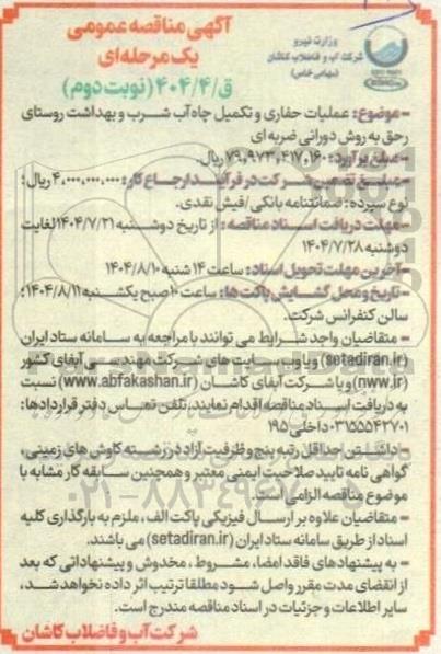 مناقصه عملیات حفاری و تکمیل چاه آب شرب و بهداشت روستا ... - نوبت دوم از کلیه افراد متخصص و شرکتها واجد شرایط دعوت به عمل میآید در مناقصه با کد خبرگزاری پارس نماد: 9689252 شرکت نمایند.