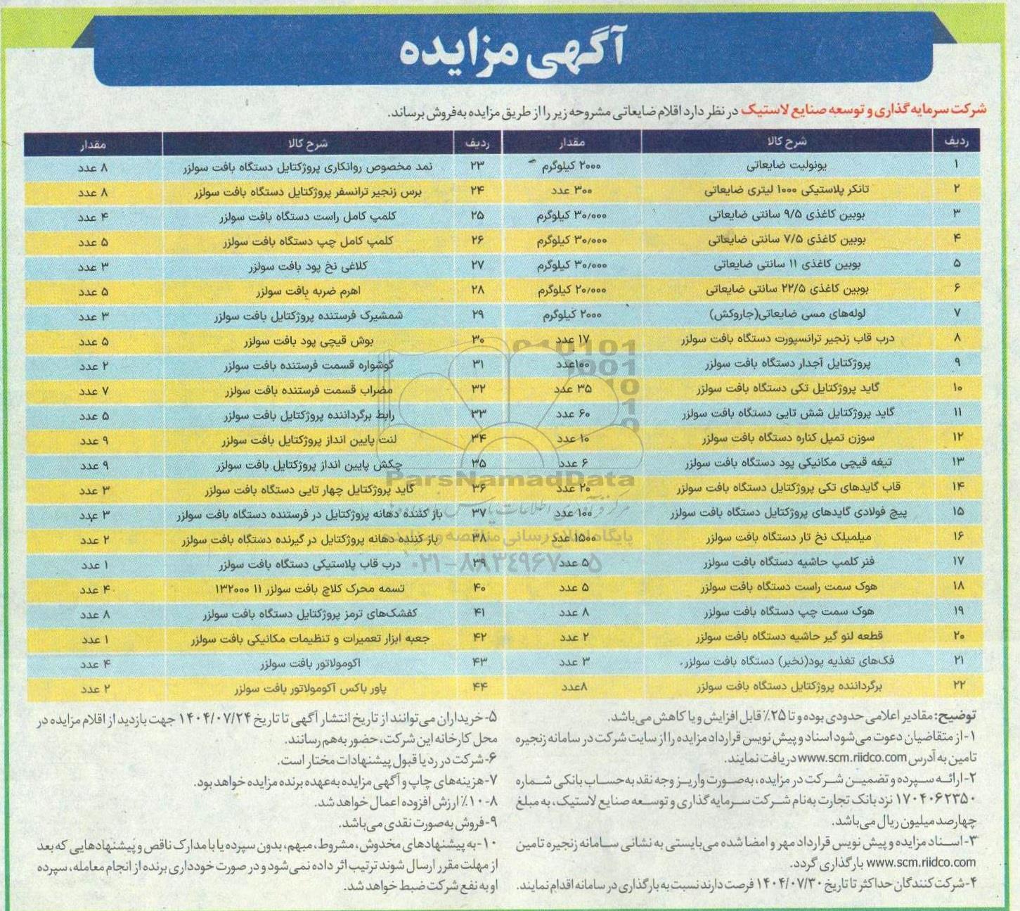 شرکت سرمایه گذاری و توسعه صنایع لاستیک در نظر دارد اقلام ضایعاتی مشروحه زیر را از طریق مزایده به فروش برساند.