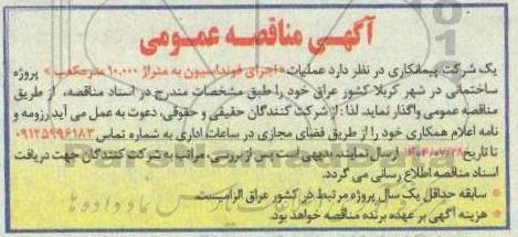 یک شرکت پیمانکاری در نظر دارد (عملیات اجرای فونداسیون به متراژ 10.000 متر مکعب) پروژه ساختمانی در شهر کربلا کشور عراق خود را طبق مشخصات مندرج در اسناد مناقصه از طریق مناقصه عمومی واگذار نماید.
