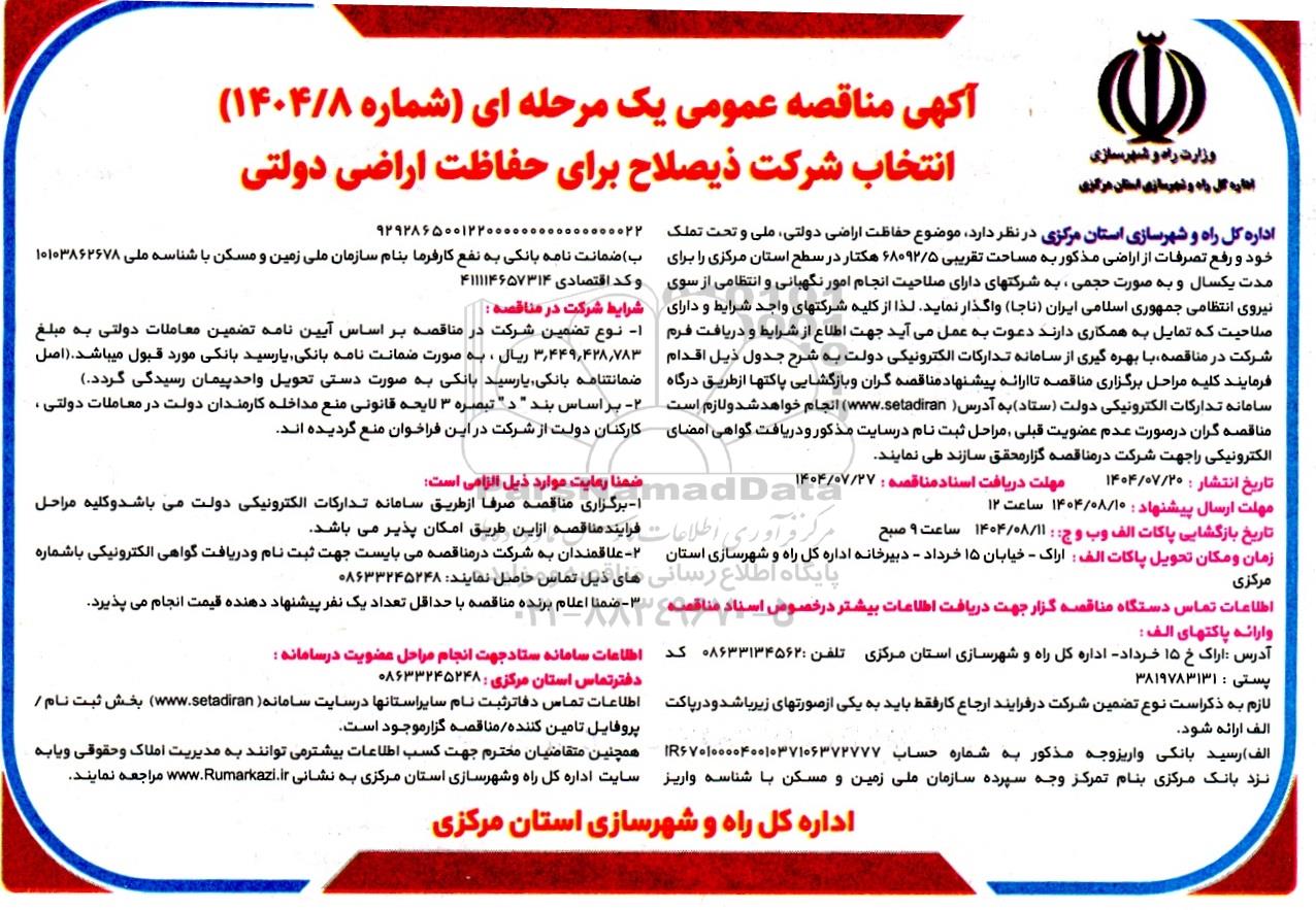 اداره کل راه و شهرسازی استان مرکزی در نظر دارد موضوع حفاظت اراضی دولتی، ملی و تحت تملک خود و رفع تصرفات از اراضی مذکور به مساحت تقریبی 68093.5 هکتار در سطح استان مرکزی را برای مدت یکسال و به صورت حجمی ، به شرکتهای دارای صلاحیت انجام امور نگهبانی و انتظامی از سوی نیروی انتظامی جمهوری اسلامی ایران (ناجا) واگذار نماید. لذا از کلیه شرکتهای واجد شرایط و دارای صلاحیت که تمایل به همکاری دارند دعوت به عمل می آید جهت اطلاع از شرایط و دریافت فرم -شرکت در مناقصه با بهره گیری از سامانه تدارکات الکترونیکی دولت به شرح جدول ذیل اقدام فرمایند کلیه مراحل برگزاری مناقصه تا ارائه پیشنهاد مناقصه گران و بازگشایی پاکتها از طریق درگاه سامانه تدارکات الکترونیکی دولت (ستاد) به آدرس ستاد ایران انجام خواهد شد و لازم است مناقصه گران در صورت عدم عضویت قبلی مراحل ثبت نام درسایت مذکور و دریافت گواهی امضای الکترونیکی راجهت شرکت در مناقصه گزار محقق سازند طی نمایند.