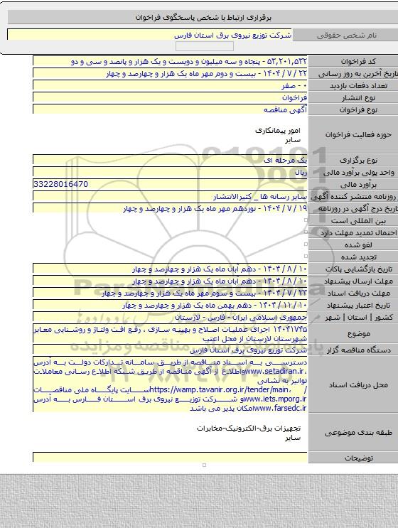 ۱۴۰۴۱۷۴۵ اجرای عملیات اصلاح و بهینه سازی ، رفع افت ولتاژ و روشنایی معابر شهرستان لارستان از محل اعتب