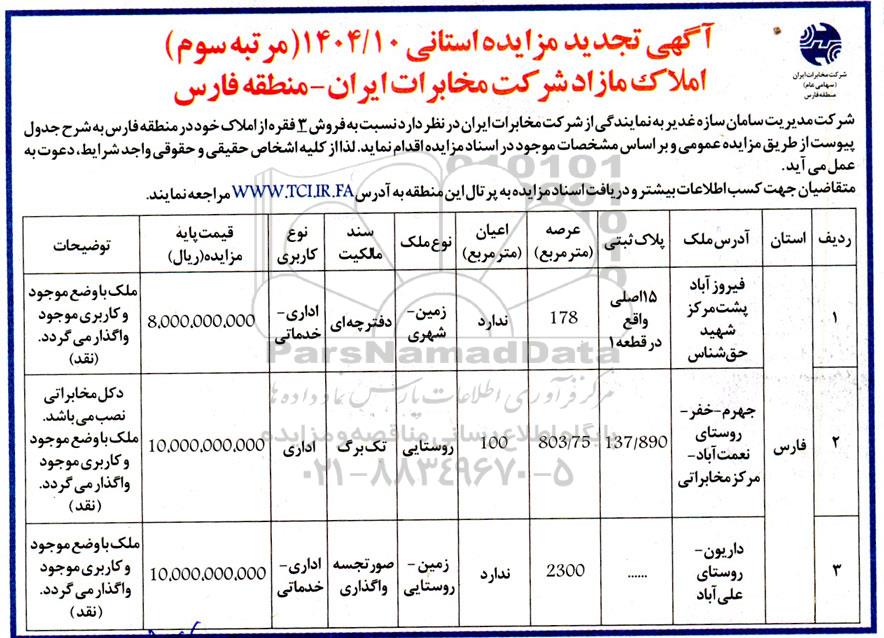 املاک مازاد شرکت مخابرات ایران - منطقه فارس