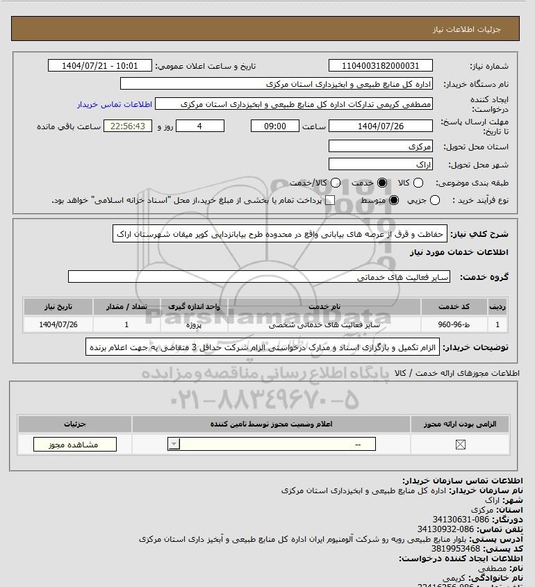 شرح کلی نیاز: حفاظت و قرق از عرصه های بیابانی واقع در محدوده طرح بیابانزدایی کویر میقان شهرستان اراک
