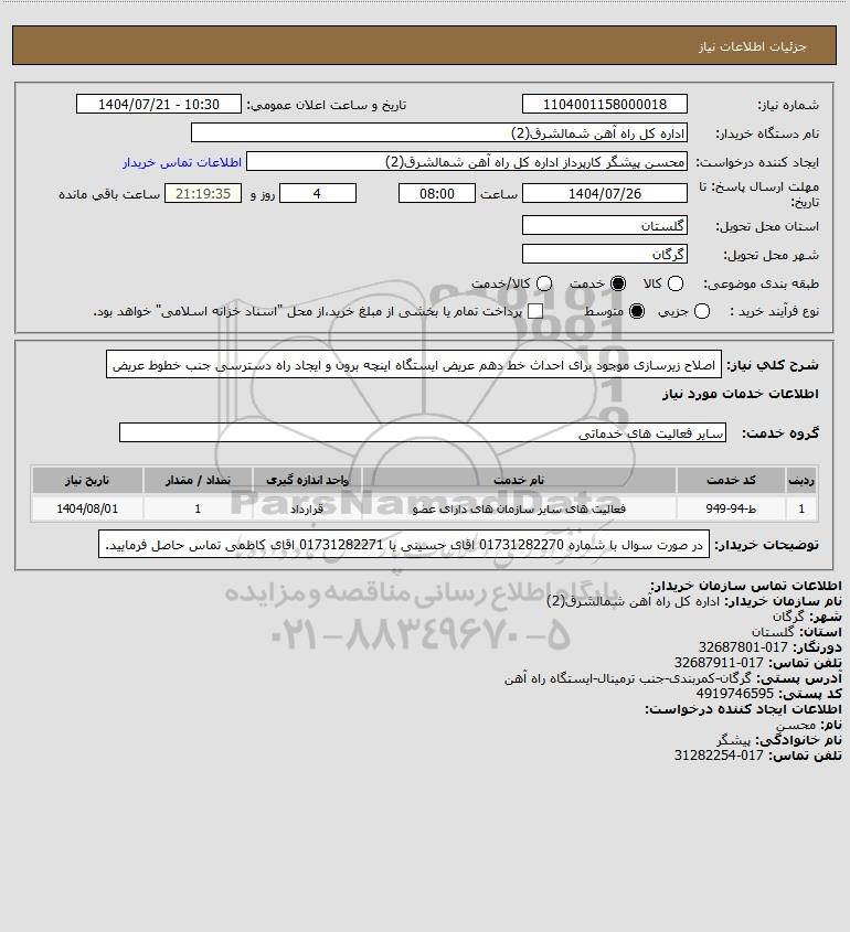 شرح کلی نیاز: اصلاح زیرسازی موجود برای احداث خط دهم عریض ایستگاه اینچه برون و ایجاد راه دسترسی جنب خطوط عریض