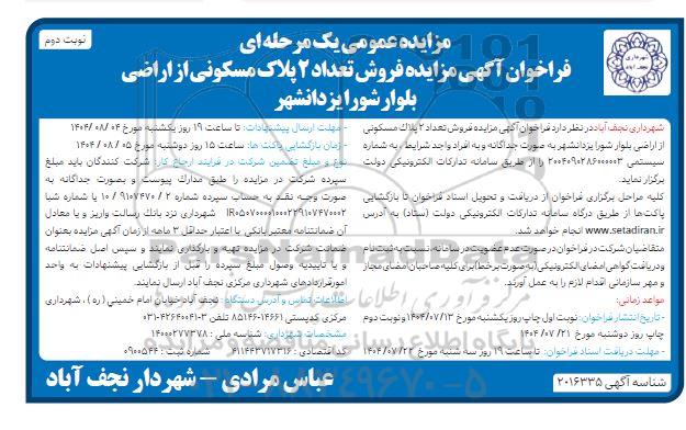 فراخوان آگهی مزایده فروش تعداد 2 پلاک مسکونی از اراضی بلوار شورا یزدانشهر