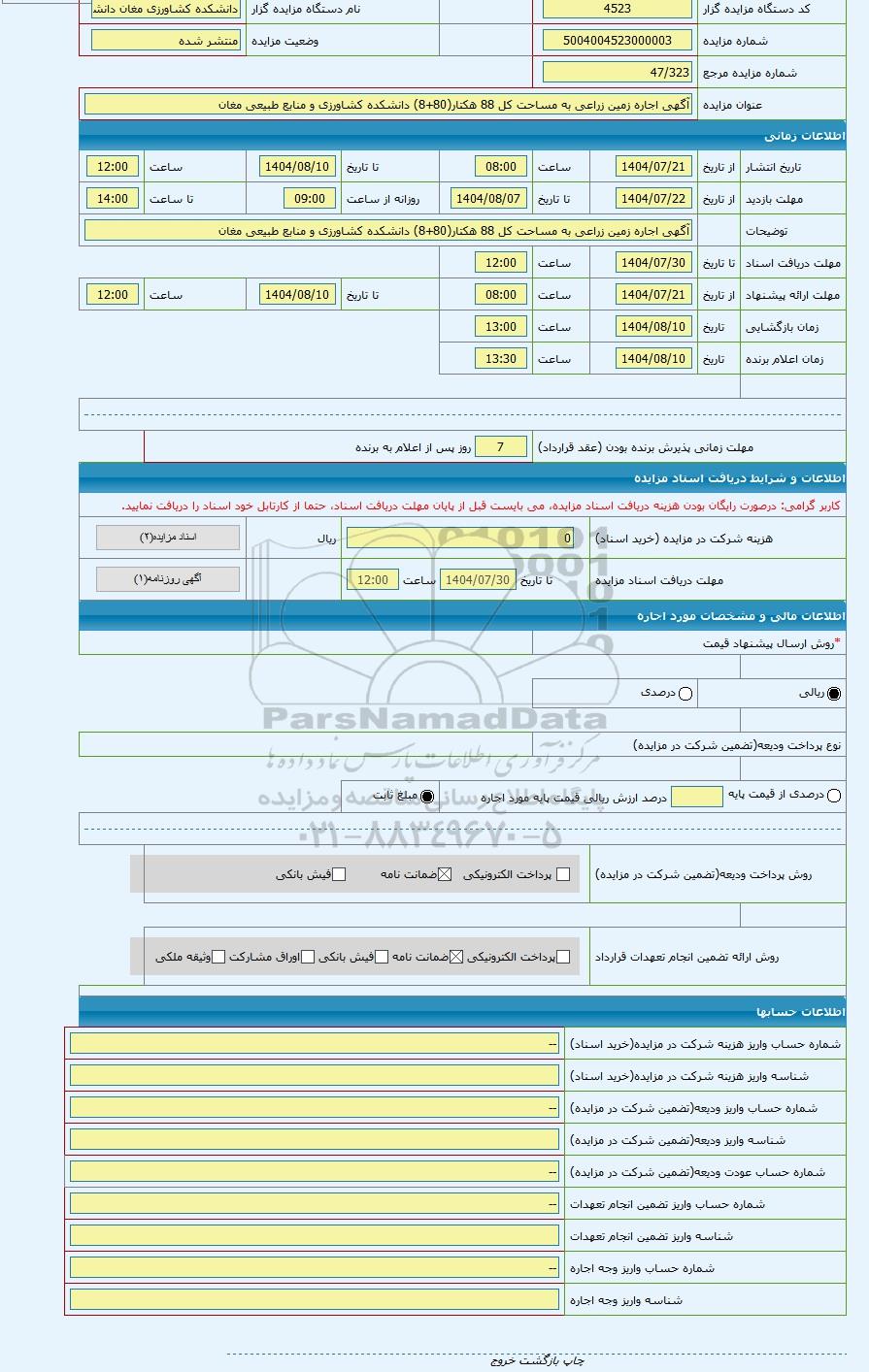 مزایده عمومی مزایده آگهی اجاره زمین زراعی به مساحت کل 88 هکتار(80+8) دانشکده کشاورزی و منابع طبیعی مغان برگزار میگردد. از کلیه افراد متخصص و شرکت‌های واجد شرایط دعوت به عمل می‌آید تا در این مزایده با کد خبرگزاری پارس نماد : 9690416 شرکت نمایند تاریخ شروع مزایده : 1404/07/21 مهلت شرکت در مزایده: تا پایان روز 1404/07/30 مکان برگزاری اموال واگذاری استان‌های اردبیل و دسته‌بندی‌های مربوط به این حراجی ماشین آلات و تجهیزات کشاورزی و دام پروری میباشد.