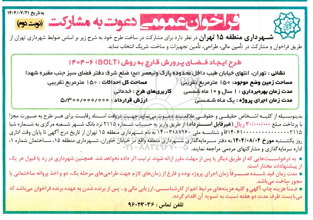 شهرداری منطقه 15 تهران در نظر دارد برای مشارکت در ساخت طرح خود به شرح زیر بر اساس ضوابط شهرداری تهران از طریق فراخوان و مشارکت در تأمین مالی طراحی، تأمین تجهیزات و ساخت، شریک انتخاب نماید.