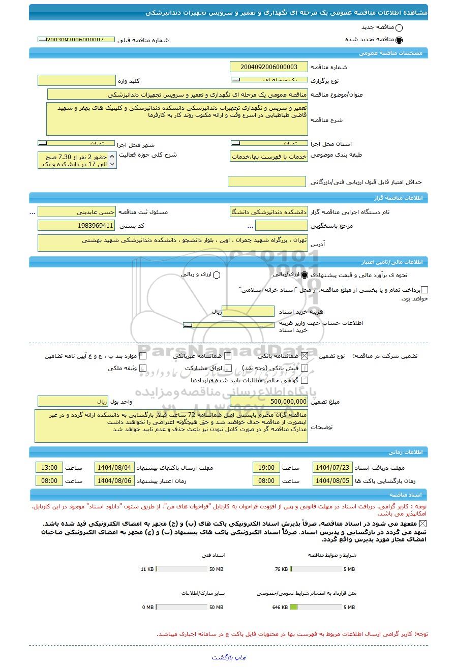 نام دستگاه اجرایی مناقصه گزاردانشکده دندانپزشکی دانشگاه علوم پزشکی شهید بهشتیمسئول ثبت مناقصهحسن عابدینی