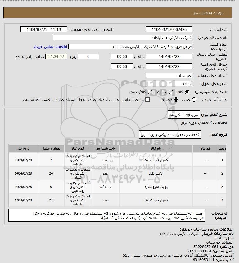 استعلام بها و موضوع استعلام استعلام نورپردازی تانکی ها به اطلاع کلیه شرکتها و افراد متخصص واجد شرایط میرساند، آگهی گذار در نظر دارد از طریق استعلام بها، نسبت به انتخاب و دریافت پیشنهادات اقدام نماید. این استعلام با کد آگهی ثبت شده در سامانه خبرگزاری پارس نماد : 9690626 منتشر شده است. مشخصات استعلام : تاریخ شروع استعلام: 1404/07/21 آخرین مهلت ارسال پیشنهاد قیمت : 1404/07/28 و محل اجرای پروژه : استان خوزستان میباشد. استعلام قیمت مورد درخواست : استعلام نورپردازی تانکی ها با دستهبندیهای تخصصی و گروه های مرتبط : ابزار دقیق, صنایع روشنایی, اتوماسیون ، مراکز کنترل صنعتی, منابع تغذیه, نورپردازی, تجهیزات و خدمات انرژی خورشیدی, تجهیزات برق و الکترونیک, استعلام اطلاع رسانی میگردد.