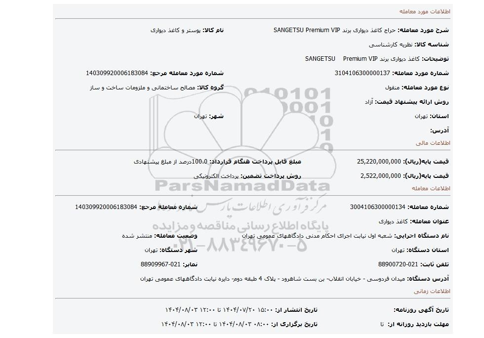 | شماره معامله: 3004106300000134 | شماره معامله مرجع: 140309920006183084 | |