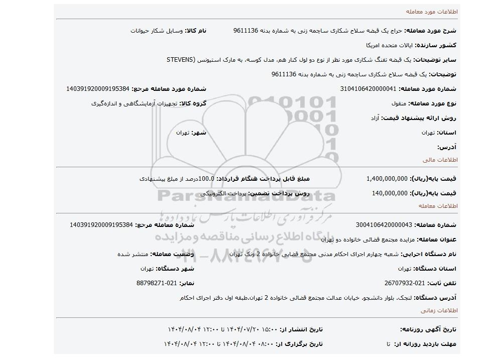| شماره مورد معامله: 3104106420000041 | شماره مورد معامله مرجع: 140391920009195384 | |