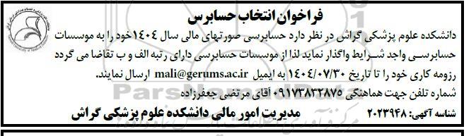 لذا از موسسات حسابرسی دارای رتبه الف و ب تقاضا می گردد رزومه کاری خود را تا تاریخ 1404.7.30 به ایمیل mali@gerums.ac.ir ارسال نمایند.