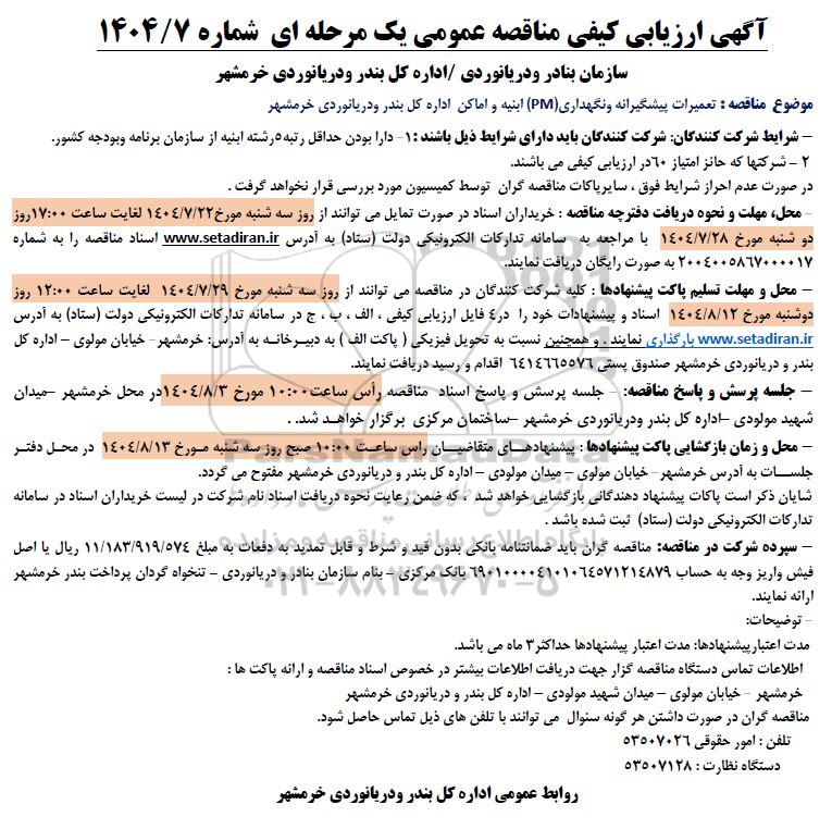 موضوع مناقصه : تعمیرات پیشگیرانه و نگهداری (PM) ابنیه و اماکن اداره کل بندر و دریانوردی خرمشهر
