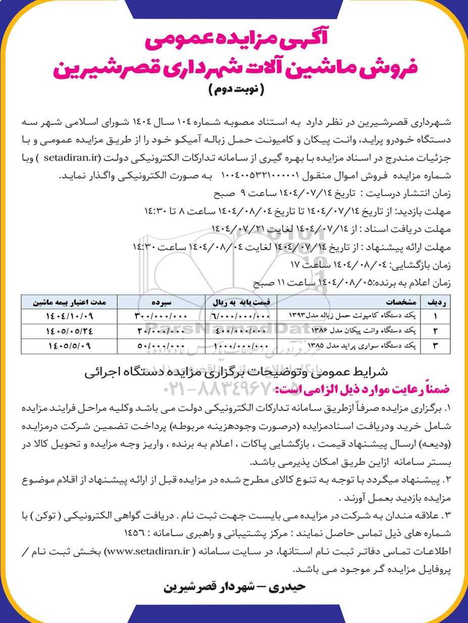 شهرداری قصر شیرین در نظر دارد به استناد مصوبه شماره 104 سال 1404 شورای اسلامی شهر سه دستگاه خودرو پراید، وانت پیکان و کامیونت حمل زباله آمیکو خود را از طریق مزایده عمومی و با جزئیات مندرج در اسناد مزایده با بهره گیری از سامانه تدارکات الکترونیکی دولت ستاد ایران وبا شماره مزایده فروش اموال منقول 1004005321000001 به صورت الکترونیکی واگذار نماید