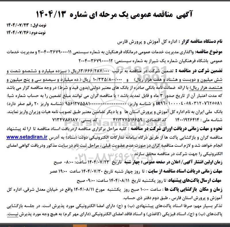 موضوع مناقصه : واگذاری مدیریت خدمات عمومی درمانگاه فرهنگیان به شماره سیستمی 2004003679000011 و مدیریت خدمات عمومی باشگاه فرهنگیان شماره یک شیراز به شماره سیستمی 2004003679000012