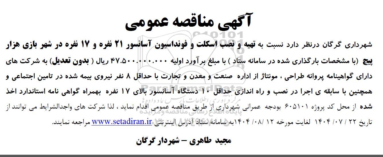 شهرداری گرگان در نظر دارد نسبت به تهیه و نصب اسکلت و فونداسیون آسانسور 21 نفره و 17 نفره در شهر بازی هزار پیچ با مشخصات بارگذاری شده در سامانه ستاد ( با مبلغ برآورد اولیه 47.500.000.000 ریال ) بدون تعدیل به شرکت های دارای گواهینامه پروانه طراحی ، مونتاژ از اداره صنعت و معدن و تجارت با حداقل 8 نفر نیروی بیمه شده در تامین اجتماعی و همچنین با سابقه ی اجرا در نصب و راه اندازی حداقل 10 دستگاه آسانسور بالای 17 نفره بهمراه گواهی نامه استاندارد اخذ شده از محل کد پروژه 605101 بودجه عمرانی شهرداری از طریق مناقصه عمومی اقدام نماید ، لذا شرکتهای واجد الشرایط می توانند از تاریخ 22 . 1404.07 لغایت مورخه 1404.08.12 به سامانه ستاد آدرس اینترنتی ستاد ایران مراجعه نمایند.