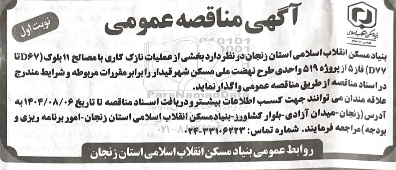 بنیاد مسکن انقلاب اسلامی استان زنجان در نظر دارد بخشی از عملیات نازک کاری با مصالح 11 بلوک (D67 تا (77) فاز 5 از پروژه 519 واحدی طرح نهضت ملی مسکن شهر قیدار را برابر مقررات مربوطه و شرایط مندرج در اسناد مناقصه از طریق مناقصه عمومی واگذار نماید.