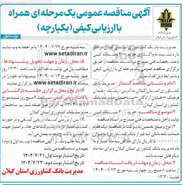 مدیریت بانک کشاورزی استان گیلان در نظر دارد نسبت به واگذاری خرید 300 دستگاه کیس با مشخصات فنی مندرج در اسناد مناقصه از طریق برگزاری مناقصه عمومی یک مرحله ای با ارزیابی کیفی و با شرایط ذیل اقدام نماید.
