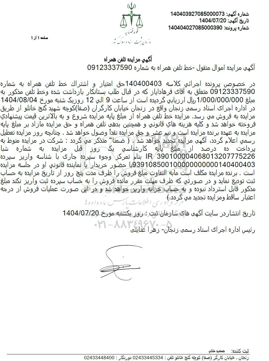 آگهی مزایده اموال منقول خط تلفن همراه به شماره 09123337590