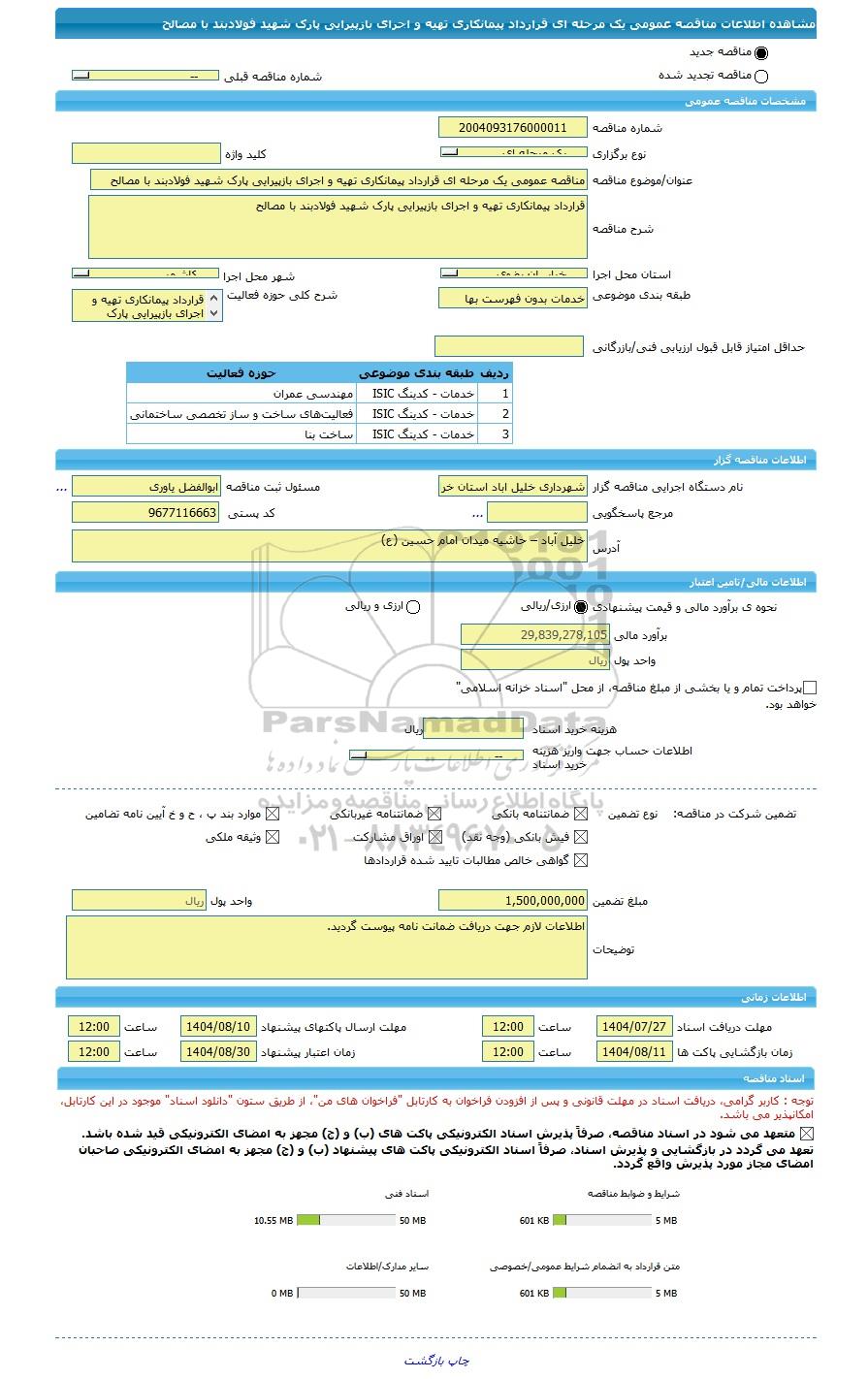 مناقصه مناقصه عمومی یک مرحله ای قرارداد پیمانکاری تهیه و اجرای بازپیرایی پارک شهید فولادبند با مصالح از کلیه افراد متخصص و شرکتها واجد شرایط دعوت به عمل میآید در مناقصه با کد خبرگزاری پارس نماد: 9691752 شرکت نمایند.