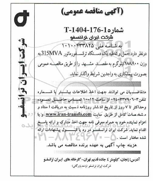 در نظر حمل و تخلیه یک دستگاه ترانسفورماتور 315MVA به وزن 188.900 کیلوگرم به مقصد مشهد را از طریق مناقصه عمومی بصورت پیمانکاری به واجدین شرایط واگذار نماید.