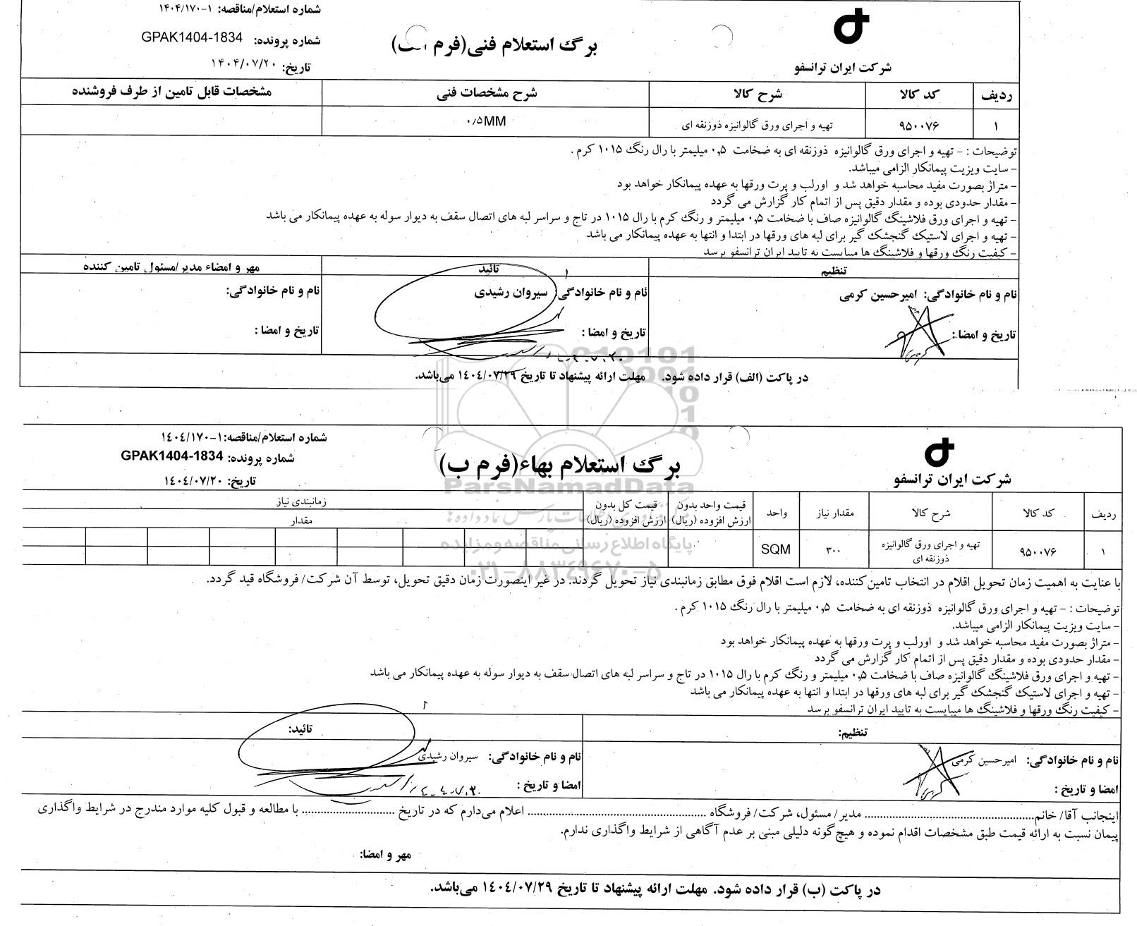 استعلام، مناقصه تهیه و اجرای ورق گالوانیزه ذوزنقه ای -مناقصه روز دوشنبه بیست و یکم مهر ماه 1404, استعلام، مناقصه تهیه و اجرای ورق گالوانیزه ذوزنقه ای