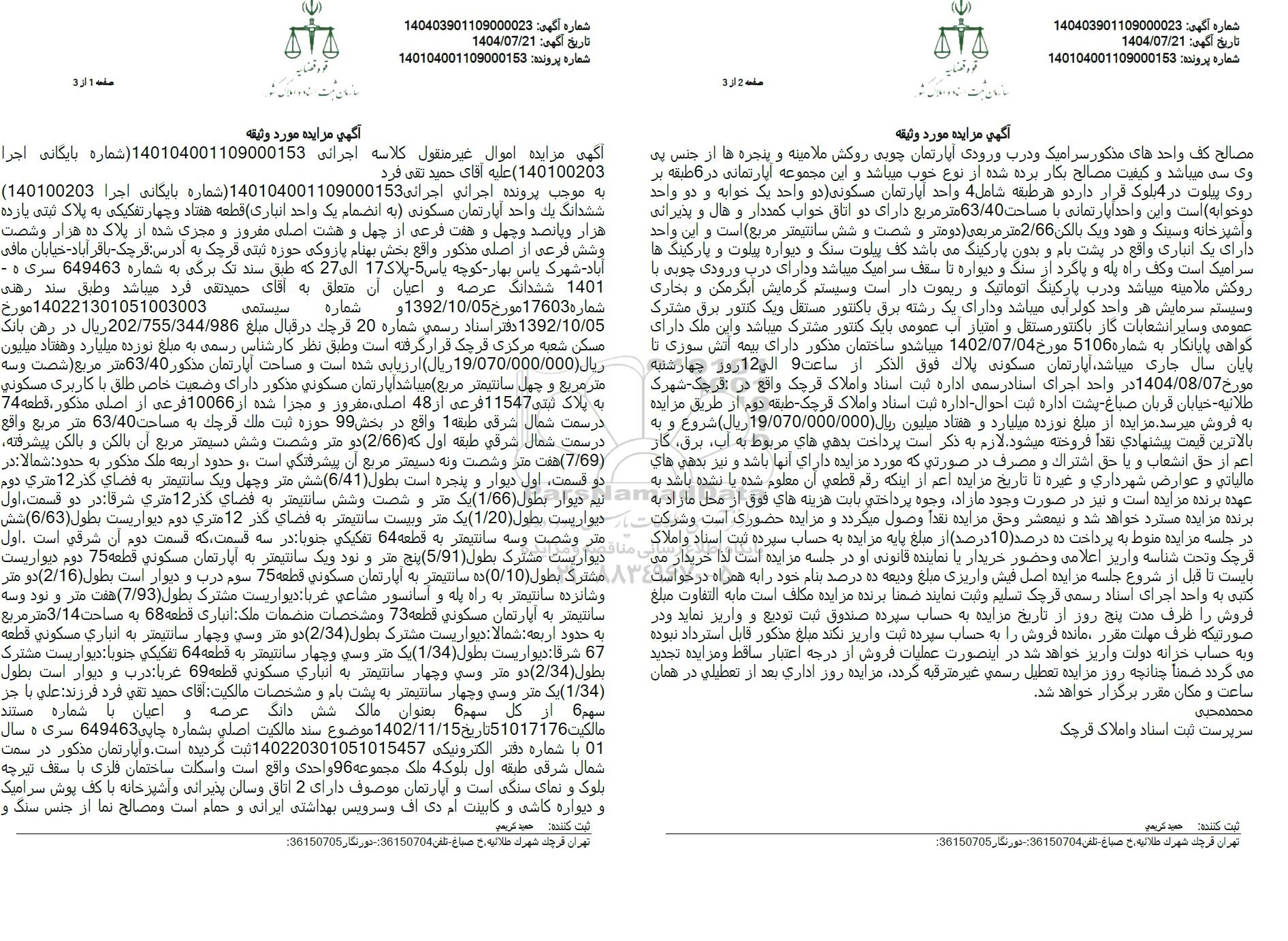 آگهی مزایده اموال غیر منقول کلاسه اجرائی 140104001109000153 (شماره بایگانی اجرا 140100203) علیه آقای حمید تقی فرد