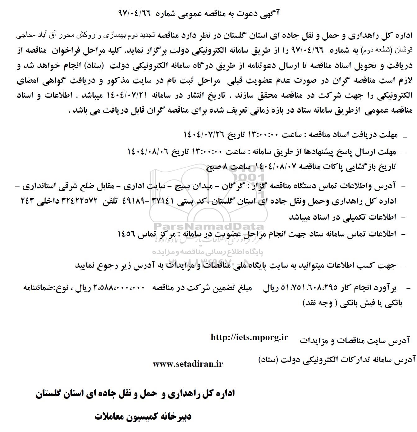 اداره کل راهداری و حمل و نقل جاده ای استان گلستان در نظر دارد مناقصه تجدید دوم بهسازی و روکش محور آق آباد - حاجی قوشان قطعه دوم به شماره 97.04.66 را از طریق سامانه الکترونیکی دولت برگزار نماید کلیه مراحل فراخوان مناقصه از دریافت و تحویل اسناد مناقصه تا ارسال دعوتنامه از طریق درگاه سامانه الکترونیکی دولت (ستاد) انجام خواهد شد و لازم است مناقصه گران در صورت عدم عضویت قبلی مراحل ثبت نام در سایت مذکور و دریافت گواهی امضای الکترونیکی را جهت شرکت در مناقصه محقق سازند. تاریخ انتشار در سامانه 1404.7.21 میباشد. اطلاعات و اسناد مناقصه عمومی از طریق سامانه ستاد در بازه زمانی تعریف شده برای مناقصه گران قابل دریافت می باشد .