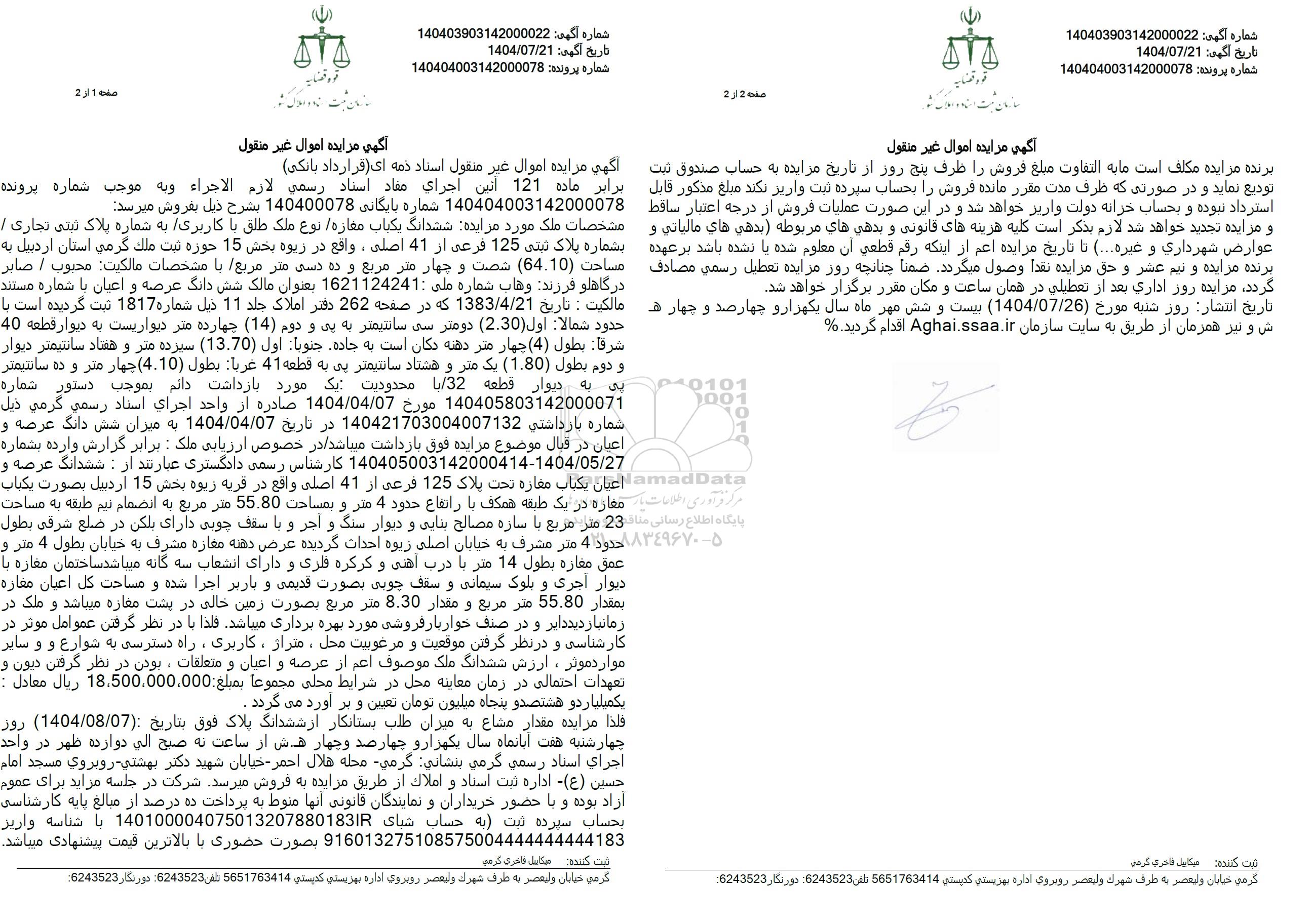 آگهی مزایده اموال غیر منقول اسناد ذمه ای قرارداد بانکی