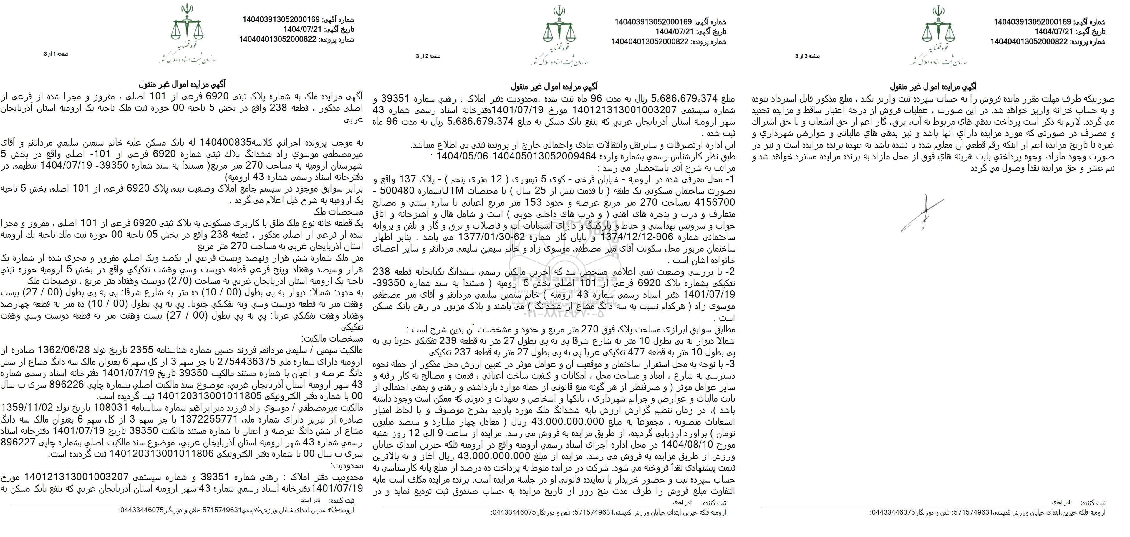 موضوع مزایده : ملک به شماره ثبتی 6920 فرعی از 101 اصلی، مفروز و مجزی شده از فرعی از اصلی مذکور به مساحت 270 مترمربع به ارزش 43.000.000.000 ریال