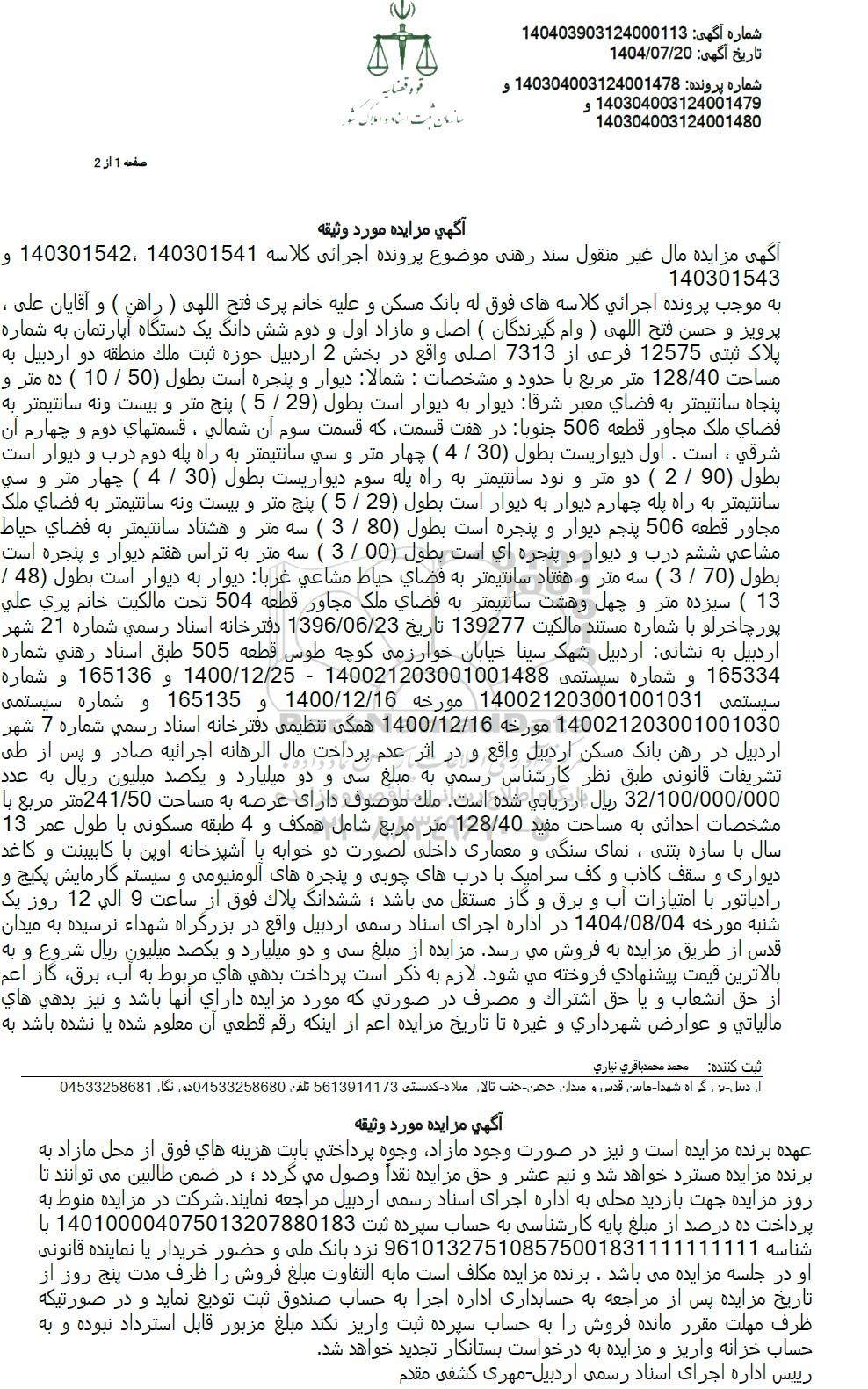 آگهی مزایده مال غیر منقول سند رهنی موضوع پرونده اجرائی کلاسه 140301541 140301542 و 140301543