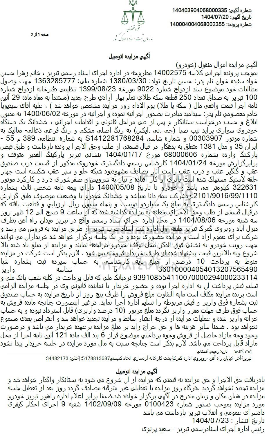 بموجب پرونده اجرایی کلاسه 14002575 مطروحه در اداره اجرای اسناد رسمی تبریز ، خانم زهرا حسین خواه سفیده خوان نام پدر حسین تاریخ تولد: 1380.03.30 شماره ملی : 1363285777 جهت وصول مطالبات خود موضوع سند ازدواج شماره 9022 مورخه 1399.08.23 تنظیمی دفترخانه ازدواج شماره 100 تبریز به صداق تعداد 250 قطعه سکه طلای تمام بهار آزادی طرح جدید (مستندا به مفاد ماده 29 آئین نامه اجرا قیمت واقعی مال (سکه یا طلا) یوم الاداء روز مزایده مشخص خواهد شد) ، علیه آقای سیدپویا خادم معصومی نام پدر: سیدامید مبادرت بصدور اجرائیه نموده و اجرائیه در مورخه 1400.06.02 به مدیون ابلاغ و حسب درخواست بستانکار و پس از طی مراحل قانونی و اقدامات اجرائی، ششدانگ یک دستگاه خودروی سواری پراید تیپ صبا (جی . تی . ایکس) به رنگ اصلی مشکی و رنگ فرعی ذغالی - متالیک به شماره موتور 00303907 و شماره شاسی S1412281768284 به شماره انتظامی 389 م 55 - ایران 35 و مدل 1381 متعلق به بدهکار در قبال قسمتی از طلب وحق الاجرا پرونده بازداشت و طبق قبض پارکینگ وارده بشماره 68000606 مورخ 1404.01.17 بنشانی تبریز پارکینگ الغدیر متوقف و برابرگزارش مورخه 1404.01.24 کارشناس رسمی دادگستری خودروی مذکور از قسمت درب صندوق عقب و گلگیر عقب و درب عقب راست آثار تصادف مشهود بود شبکه جلو و سپر عقب شکسته است چهار حلقه لاستیک مستهلک شده است باتری از کار افتاده و نیاز به سرویس و صفر شوری دارد و کارکرد موتور 322631 کیلومتر می باشد و خودرو تا تاریخ 1400.05.08 دارای بیمه نامه شخص ثالث بشماره 2101.9016.99.1110 نزد شرکت بیمه دانا میباشد و ششدانگ خودرو با با وضعیت موصوف طبق گزارش گزارش کارشناس رسمی دادگستری به مبلغ یک میلیارد و دویست و پنجاه میلیون ریال ارزیابی و قطعیت یافته که در قبال قسمتی از طلب وحق الاجرای متعلقه به مزایده گذاشته شده که از ساعت 9 صبح الی 12 ظهر روز سه شنبه مورخه 1404.08.06 در محل اداره اجرای اسناد رسمی واقع در تبریز میدان راه آهن بطرف دیزل آباد روبروی گمرک تبریز طبقه اول اداره ثبت اسناد غرب تبریز از طریق مزایده به فروش می رسد و شرکت برای عموم آزاد است و مزایده حضوری بوده و در یک جلسه برگزار خواهد شد خریداران می توانند جهت رویت خودرو به نشانی فوق الذکر محل توقف خودرو مراجعه نمایند و مزایده از مبلغ یاد شده بالا شروع و به بالاترین قیمت پیشنهاد شده از طرف خریدار فروخته می شود. لازم بذکر است شرکت در مزایده منوط به پرداخت 10 درصد از مبلغ پایه کارشناسی به حساب سپرده ثبت بشماره شبا 360100004054013207565490 با شناسه واریز 939108554110070000294000233114 نزد بانک ملی که قابل پرداخت در کلیه شعب بانک ملی و تسلیم فیش پرداخت آن به اداره اجرا بوده و حضور خریدار یا نماینده قانونی وی در جلسه مزایده الزامی است برنده مزایده مکلف است ما به التفاوت مبلغ فروش را ظرف پنج روز از تاریخ مزایده به حساب صندوق ثبت بشماره فوق واریز و فیش مربوطه را تسلیم اداره اجرا نماید در غیر اینصورت چنانچه مانده فروش به حساب فوق ظرف مهلت مقرر واریز نگردد مبلغ مزبور (10 درصد واریزی) قابل استرداد نبوده و به حساب خزانه واریز شده و عملیات مزایده از درجه اعتبار ساقط و مزایده تجدید خواهد شد و اعتراض بعدی مسموع نخواهد بود . ضمنا سایر هزینه ها و حق حراج زاید بر مبلغ مزایده بر عهده خریدار می باشد و در صورت وجود وجه مازاد حاصل از فروش وجوه پرداختی موضوع فراز 6 بند الف ماده 121 آئین نامه اجرا از محل مازاد قابل پرداخت می باشد. لازم بذکر است چنانچه نسبت به مال مورد مزایده در جلسه خریدار پیدا نشود با دریافت حق الاجرا و حق مزایده به قیمتی که مزایده از آن شروع میشود به بستانکار واگذار خواهد شد و مزایده تجدید نخواهد گردید. هرگاه روز مزایده با تعطیلی غیر مترقبه مصادف گردد روز بعد از تعطیل جلسه مزایده در همان مکان و زمان مندرج در آگهی برگزار خواهد شد. ضمنا برابر اعلام اداره راهور تبریز خودرو مورد مزایده بموجب دستور شماره 0100423 مورخه 1402.09.09 شعبه 9 اجرای احکام کیفری دادسرای عمومی و انقلاب تبریز بازداشت می باشد.