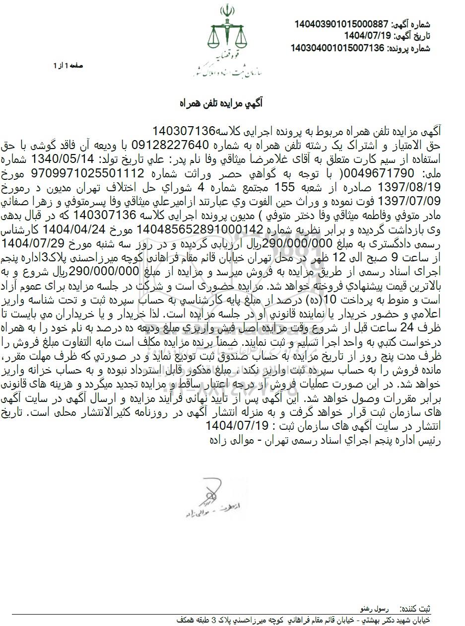 حق الامتیاز و اشتراک یک رشته تلفن همراه به شماره 09128227640 با ودیعه آن فاقد گوشی با حق استفاده از سیم کارت متعلق به آقای غلامرضا میثاقی وفا نام پدر علی تاریخ تولد: 1340.05.14 شماره ملی: 0049671790 با توجه به گواهی حصر وراثت شماره 9709971025501112 مورخ 1397.08.19 صادره از شعبه 155 مجتمع شماره 4 شورای حل اختلاف تهران مدیون درمورخ 1397.07.09 فوت نموده و وراث حین الفوت وی عبارتند از امیر علی میثاقی وفا پسر متوفی و زهرا صفائی مادر متوفی وفاطمه میثاقی وفا دختر متوفی مدیون پرونده اجرایی کلاسه 140307136 که در قبال بدهی وی بازداشت گردیده و برابر نظریه شماره 140485652891000142 مورخ 1404.04.24 کارشناس رسمی دادگستری به مبلغ 290.000.000 ریال ارزیابی گردیده و در روز سه شنبه مورخ 1404.07.29 از ساعت 9 صبح الى 12 ظهر در محل تهران خیابان قائم مقام فراهانی کوچه میرزا حسنی پلاک 3 اداره پنجم اجرای اسناد رسمی از طریق مزایده به فروش میرسد و مزایده از مبلغ 290.000.000 ریال شروع و به بالاترین قیمت پیشنهادی فروخته خواهد شد. مزایده حضوری است و شرکت در جلسه مزایده برای عموم آزاد است و منوط به پرداخت 10 ده درصد از مبلغ پایه کارشناسی به حساب سپرده ثبت و تحت شناسه واریز اعلامی و حضور خریدار یا نماینده قانونی او در جلسه مزایده است. لذا خریدار و یا خریداران می بایست تا ظرف 24 ساعت قبل از شروع وقت مزایده اصل فیش واریزی مبلغ ودیعه ده درصد به نام خود را به همراه درخواست کتبی به واحد اجرا تسلیم و ثبت نمایند. ضمناً برنده مزایده مکلف است ما به التفاوت مبلغ فروش را ظرف مدت پنج روز از تاریخ مزایده به حساب صندوق ثبت تودیع نماید و در صورتی که ظرف مهلت مقرر مانده فروش را به حساب سپرده ثبت واریز نکند، مبلغ مذکور قابل استرداد نبوده و به حساب خزانه واریز خواهد شد. در این صورت عملیات فروش از درجه اعتبار ساقط و مزایده تجدید میگردد و هزینه های قانونی برابر مقررات وصول خواهد شد. این آگهی پس از تایید نهایی فرآیند مزایده و ارسال آگهی در سایت آگهی های سازمان ثبت قرار خواهد گرفت و به منزله انتشار آگهی در روزنامه کثیر الانتشار محلی است. تاریخ انتشار در سایت آگهی های سازمان ثبت : 1404.07.19 رئیس اداره پنجم اجرای اسناد رسمی تهران - موالی زاده