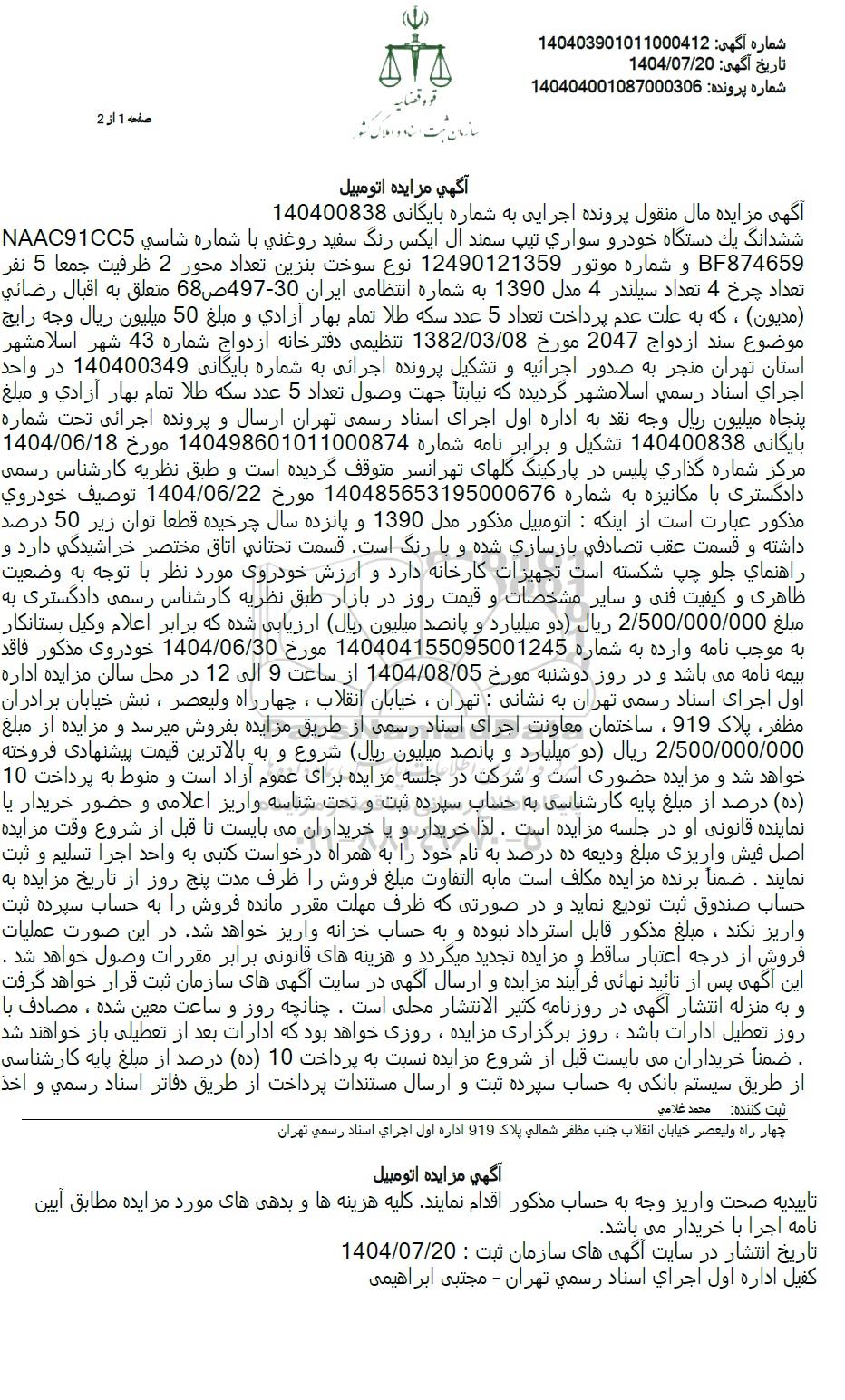 ششدانگ یک دستگاه خودرو سواری تیپ سمند ال ایکس رنگ سفید روغنی با شماره شاسي NAAC91CC5 BF874659 و شماره موتور 12490121359 نوع سوخت بنزین تعداد محور 2 ظرفیت جمعا 5 نفر تعداد چرخ 4 تعداد سیلندر 4 مدل 1390 به شماره انتظامی ایران 30-497 ص 68 متعلق به اقبال رضاني (مدیون) ، که به علت عدم پرداخت تعداد 5 عدد سکه طلا تمام بهار آزادي و مبلغ 50 میلیون ریال وجه رایج موضوع سند ازدواج 2047 مورخ 1382.03/08 تنظیمی دفترخانه ازدواج شماره 43 شهر اسلامشهر استان تهران منجر به صدور اجرائیه و تشکیل پرونده اجرائی به شماره بایگانی 140400349 در واحد اجراي اسناد رسمي اسلامشهر گردیده که نیابتا جهت وصول تعداد 5 عدد سکه طلا تمام بهار آزادی و مبلغ پنجاه میلیون ریال وجه نقد به اداره اول اجرای اسناد رسمی تهران ارسال و پرونده اجرائی تحت شماره 1404/06/18 بایگانی 140400838 تشکیل و برابر نامه شماره 140498601011000874 مورخ مرکز شماره گذاری پلیس در پارکینگ گلهای تهرانسر متوقف گردیده است و طبق نظریه کارشناس رسمی دادگستری با مکانیزه به شماره 140485653195000676 مورخ 1404/06/22 توصيف خودروي مذکور عبارت است از اینکه : اتومبیل مذکور مدل 1390 و پانزده سال چرخیده قطعا توان زیر 50 درصد داشته و قسمت عقب تصادفي بازسازي شده و با رنگ است. قسمت تحتاني اتاق مختصر خراشیدگی دارد و راهنمای جلو چپ شکسته است تجهیزات کارخانه دارد و ارزش خودروی مورد نظر با توجه به وضعیت ظاهری و کیفیت فنی و سایر مشخصات و قیمت روز در بازار طبق نظریه کارشناس رسمی دادگستری به مبلغ 2/500/000/000 ریال دو میلیارد و پانصد میلیون ریال ارزیابی شده که برابر اعلام وکیل بستانکار به موجب نامه وارده به شماره 140404155095001245 مورخ 1404/06/30 خودروی مذکور فاقد بیمه نامه می باشد و در روز دوشنبه مورخ 1404/08/05 از ساعت 9 الی 12 در محل سالن مزایده اداره اول اجرای اسناد رسمی تهران به نشانی : تهران ، خیابان انقلاب ، چهار راه ولیعصر ، نبش خیابان برادران مظفر، پلاک 919 ، ساختمان معاونت اجرای اسناد رسمی از طریق مزایده بفروش میرسد و مزایده از مبلغ 2/500/000/000 ریال دو میلیارد و پانصد میلیون ریال شروع و به بالاترین قیمت پیشنهادی فروخته خواهد شد و مزایده حضوری است و شرکت در جلسه مزایده برای عموم آزاد است و منوط به پرداخت 10 (ده) درصد از مبلغ پایه کارشناسی به حساب سپرده ثبت و تحت شناسه واریز اعلامی و حضور خریدار یا نماینده قانونی او در جلسه مزایده است. لذا خریدار و یا خریداران می بایست تا قبل از شروع وقت مزایده اصل فیش واریزی مبلغ ودیعه ده درصد به نام خود را به همراه درخواست کتبی به واحد اجرا تسلیم و ثبت نمایند . ضمناً برنده مزایده مکلف است ما به التفاوت مبلغ فروش را ظرف مدت پنج روز از تاریخ مزایده به حساب صندوق ثبت تودیع نماید و در صورتی که ظرف مهلت مقرر مانده فروش را به حساب سپرده ثبت واریز نکند ، مبلغ مذکور قابل استرداد نبوده و به حساب خزانه واریز خواهد شد. در این صورت عملیات فروش از درجه اعتبار ساقط و مزایده تجدید میگردد و هزینه های قانونی برابر مقررات وصول خواهد شد . این آگهی پس از تایید نهایی فرآیند مزایده و ارسال آگهی در سایت آگهی های سازمان ثبت قرار خواهد گرفت و به منزله انتشار آگهی در روزنامه کثیر الانتشار محلی است. چنانچه روز و ساعت معین شده ، مصادف با روز تعطیل ادارات باشد، روز برگزاری مزایده، روزی خواهد بود که ادارات بعد از تعطیلی باز خواهند شد . ضمنا خريداران می بایست قبل از شروع مزایده نسبت به پرداخت 10 (ده) درصد از مبلغ پایه کارشناسی از طریق سیستم بانکی به حساب سپرده ثبت و ارسال مستندات پرداخت از طریق دفاتر اسناد رسمي و اخذ