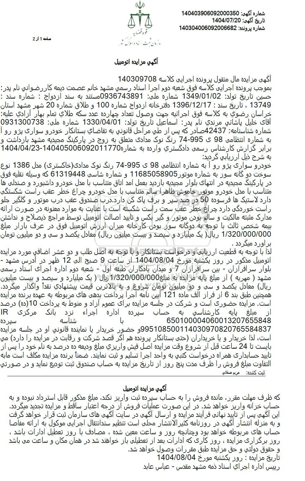 لذا با توجه به قطعیت ارزیابی و درخواست بستانکار و با توجه به اصل طلب و دو عشر اضافي مورد مزايده اتومبیل مذکور در روز یکشنبه مورخ 1404.08.04 از ساعت 9 صبح الى 12 ظهر در آدرس مشهد -بلوار سرافرازان - بین سرافرازان 7 و میدان یادگاران طبقه اول - شعبه دوم اداره اجرای اسناد رسمی مشهد ( مهریه ( از مبلغ پایه مزایده به مبلغ 1.320.000.000 ریال ) یک میلیارد و سیصد و بیست میلیون ) ریال معادل یکصد و سی و دو میلیون تومان شروع و به بالاترین قیمت پیشنهادی نقداً واگذار میگردد. همچنین طبق بند 6 از فراز الف ماده 121 آیین نامه اجرا پرداخت بدهیهای مربوطه به عهده برنده مزایده است. مزایده حضوری است و شرکت در جلسه مزایده برای عموم آزاد و منوط به پرداخت 10 (ده) درصد از مبلغ پایه کارشناسی به حساب سپرده اداره اجراء نزد بانک مرکزی IR し 650100004060013207655848 شناسه سپرده 995108500114030970820765584837 و حضور خریدار یا نماینده قانونی او در جلسه مزایده است، لذا خریدار و یا خریداران حتی بستانکار پرونده هم اگر قصد شرکت و رقابت در مزایده را دارد می بایست تا 24 ساعت قبل از شروع وقت مزایده اصل فیش واریزی مبلغ ودیعه ده درصد به نام خود را پس از تایید حسابداری همراه درخواست کتبی به واحد اجرا تسلیم و ثبت نمایند. ضمناً برنده مزایده مکلف است ما به التفاوت مبلغ فروش را ظرف مدت پنج روز از تاریخ مزایده به حساب صندوق ثبت تودیع نماید و در صورتي ثبت کننده مریم صفالي