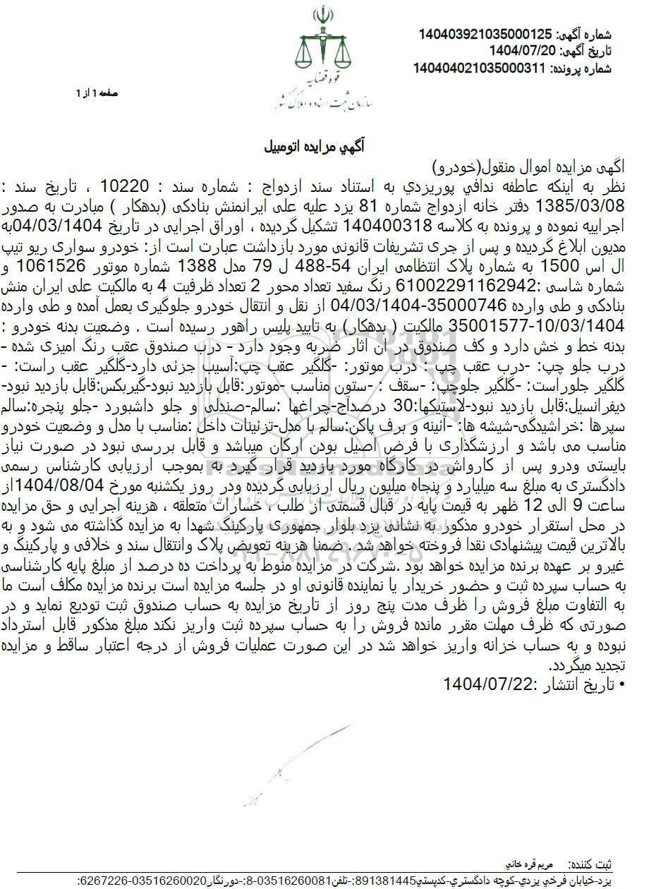 اگهی مزایده اموال منقول (خودرو) نظر به اینکه عاطفه ندافی پوریزدی به استناد سند ازدواج : شماره سند : 10220 ، تاریخ سند :