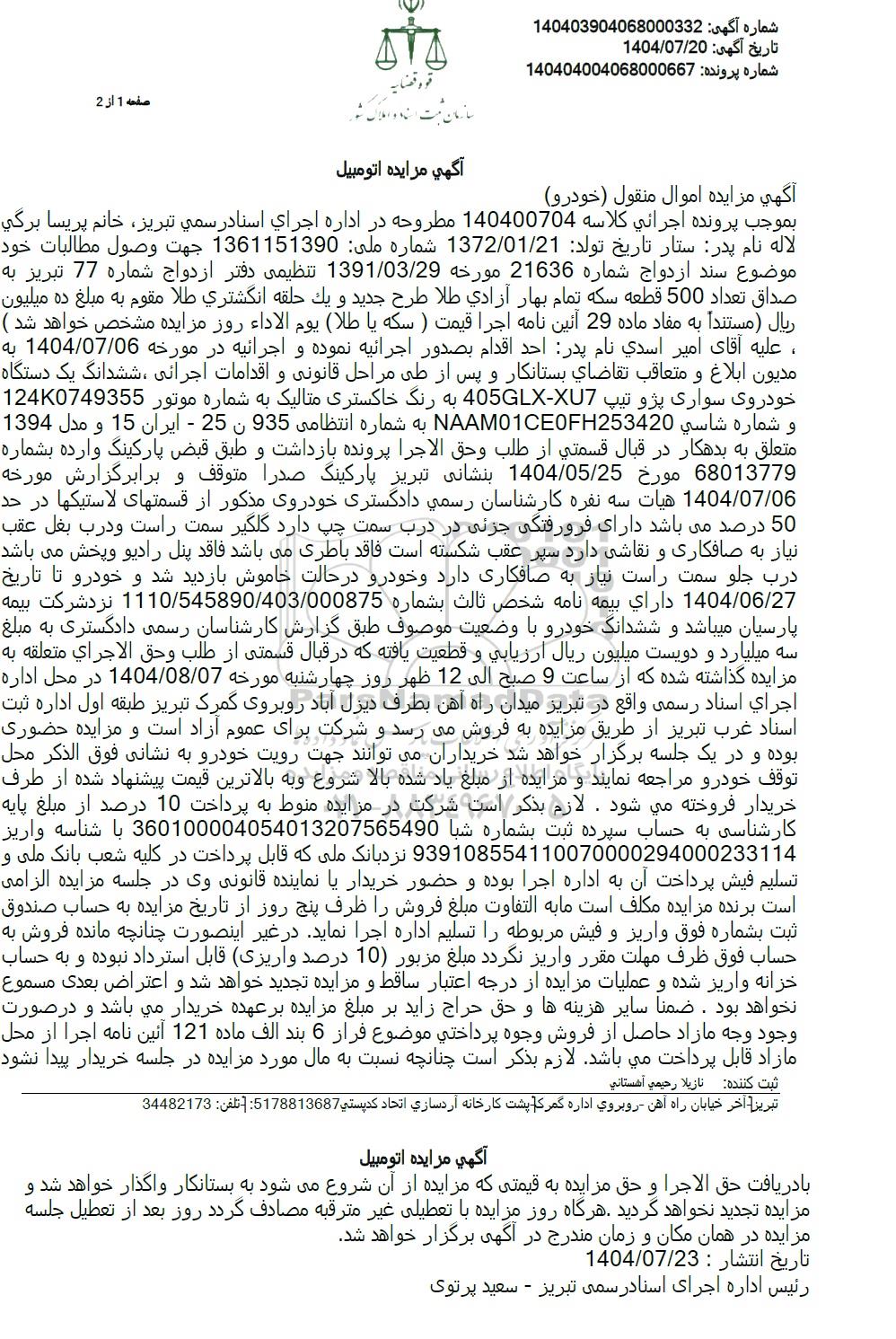 بموجب پرونده اجرائي كلاسه 140400704 مطروحه در اداره اجرای اسناد رسمي تبريز، خانم پریسا برگي لاله نام پدر ستار تاریخ تولد: 1372.01.21 شماره ملی 1361151390 جهت وصول مطالبات خود موضوع سند ازدواج شماره 21636 مورخه 1391.03.29 تنظیمی دفتر ازدواج شماره 77 تبریز به صداق تعداد 500 قطعه سکه تمام بهار آزادي طلا طرح جديد و يک حلقه انگشتری طلا مقوم به مبلغ ده میلیون ریال مستندا به مفاد ماده 29 آئین نامه اجرا قیمت ) سکه یا طلا) يوم الاداء روز مزايده مشخص خواهد شد ) عليه آقای امیر اسدي نام پدر: احد اقدام بصدور اجرائیه نموده و اجرائیه در مورخه 1404.07.06 به مدیون ابلاغ و متعاقب تقاضاي بستانکار و پس از طی مراحل قانونی و اقدامات اجرائی ، ششدانگ یک دستگاه خودروی سواری پژو تیپ 405GLX-XU7 به رنگ خاکستری متالیک به شماره موتور 124K0749355 و شماره شاسي NAAM01CEOFH253420 به شماره انتظامی 935 ن 25 - ایران 15 و مدل 1394 متعلق به بدهکار در قبال قسمتی از طلب وحق الاجرا پرونده بازداشت و طبق قبض پارکینگ وارده بشماره 68013779 مورخ 1404.05.25 بنشانی تبریز پارکینگ صدرا متوقف و برابرگزارش مورخه 1404.07.06 هیات سه نفره کارشناسان رسمی دادگستری خودروی مذکور از قسمتهای لاستیکها در حد 50 درصد می باشد دارای فرورفتگی جزئی در درب سمت چپ دارد گلگیر سمت راست و درب بغل عقب نیاز به صافکاری و نقاشی دارد سپر عقب شکسته است فاقد باطری میباشد فاقد پنل رادیو و پخش می باشد درب جلو سمت راست نیاز به صافکاری دارد و خودرو در حالت خاموش بازدید شد و خودرو تا تاریخ 1404.06.27 داراي بيمه نامه شخص ثالث بشماره 1110.545890.403.000875 نزد شرکت بیمه پارسیان میباشد و ششدانگ خودرو با وضعیت موصوف طبق گزارش کارشناسان رسمی دادگستری به مبلغ سه میلیارد و دویست میلیون ریال ارزیابی و قطعیت یافته که در قبال قسمتی از طلب وحق الاجراي متعلقه به مزایده گذاشته شده که از ساعت 9 صبح الی 12 ظهر روز چهارشنبه مورخه 1404.08.07 در محل اداره اجراي اسناد رسمی واقع در تبریز میدان راه آهن بطرف دیزل آباد روبروی گمرک تبریز طبقه اول اداره ثبت استاد غرب تبریز از طریق مزایده به فروش میرسد و شرکت برای عموم آزاد است و مزایده حضوری بوده و در یک جلسه برگزار خواهد شد خریداران می توانند جهت رویت خودرو به نشانی فوق الذکر محل توقف خودرو مراجعه نمایند و مزایده از مبلغ یاد شده بالا شروع و به بالاترین قیمت پیشنهاد شده از طرف خریدار فروخته می شود. لازم بذکر است شرکت در مزایده منوط به پرداخت 10 درصد از مبلغ پایه کارشناسی به حساب سپرده ثبت بشماره شبا 360100004054013207565490 با شناسه واریز 939108554110070000294000233114 نزدبانک ملی که قابل پرداخت در کلیه شعب بانک ملی و تسلیم فیش پرداخت آن به اداره اجرا بوده و حضور خریدار یا نماینده قانونی وی در جلسه مزایده الزامی است برنده مزایده مکلف است ما به التفاوت مبلغ فروش را ظرف پنج روز از تاریخ مزایده به حساب صندوق ثبت بشماره فوق واریز و فیش مربوطه را تسلیم اداره اجرا نماید. در غیر اینصورت چنانچه مانده فروش به حساب فوق ظرف مهلت مقرر واریز نگردد مبلغ مزبور (10) درصد واریزی قابل استرداد نبوده و به حساب خزانه واریز شده و عملیات مزایده از درجه اعتبار ساقط و مزایده تجدید خواهد شد و اعتراض بعدی مسموع نخواهد بود . ضمنا سایر هزینه ها و حق حراج زاید بر مبلغ مزایده بر عهده خریدار می باشد و در صورت وجود وجه مازاد حاصل از فروش وجوه پرداختی موضوع فراز 6 بند الف ماده 121 آئین نامه اجرا از محل ما زاد قابل پرداخت می باشد. لازم بذکر است چنانچه نسبت به مال مورد مزایده در جلسه خریدار پیدا نشود