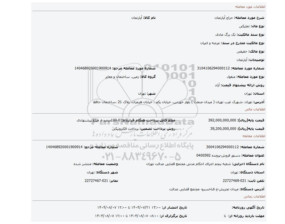 شرح مورد معامله: حراج آپارتماننام کالا: آپارتمان