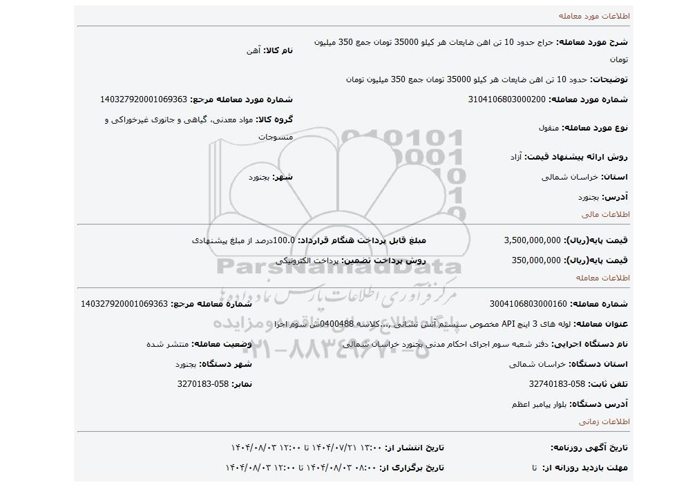 | شرح مورد معامله: حراج حدود 10 تن اهن ضایعات هر کیلو 35000 تومان جمع 350 میلیون تومان | نام کالا: آهن | |