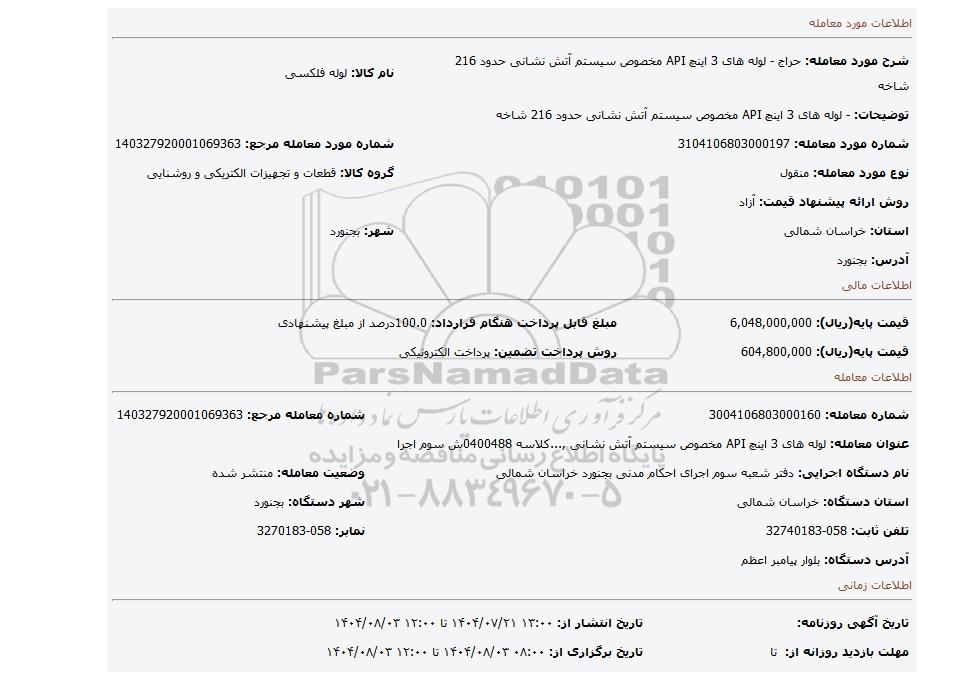 مزایده عمومی مزایده - لوله های 3 اینچ API مخصوص سیستم آتش نشانی حدود 216 شاخه برگزار میگردد. از کلیه افراد متخصص و شرکتهای واجد شرایط دعوت به عمل میآید تا در این مزایده با کد خبرگزاری پارس نماد : 9692849 شرکت نمایند تاریخ شروع مزایده : 1404/07/21 مهلت شرکت در مزایده: تا پایان روز 1404/08/03 مکان برگزاری اموال واگذاری استانهای خراسان شمالی و دستهبندیهای مربوط به این حراجی لوله و اتصالات, سیستم های ایمنی میباشد.