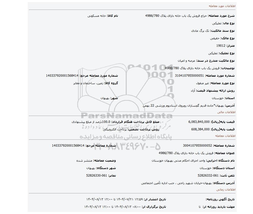 | شماره مورد معامله: 3104107955000051 | شماره مورد معامله مرجع: 140337920001568414 | |