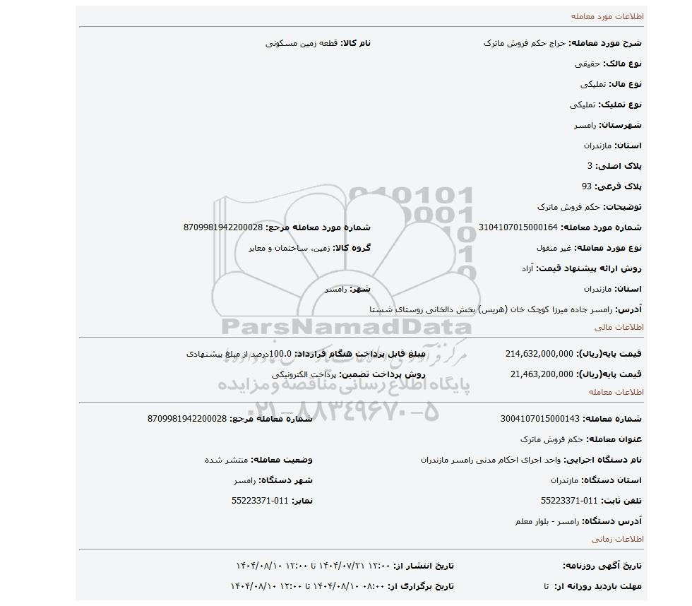 | شماره مورد معامله: 3104107015000164 | شماره مورد معامله مرجع: 8709981942200028 | |